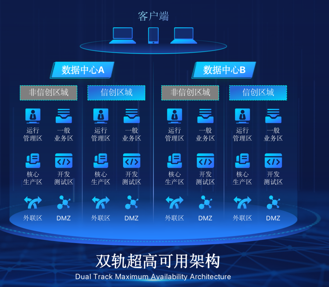 dcbox小金库app在企业面临自主创新IT基础重构过程中,推出的全新架构双轨超高可用架构(简称DTMAA),在双活数据中心的分区调度基础上,添加每个数据中心内信创域和非信创域的分域调度,来实现分区分域协同的多活双轨超高可用。